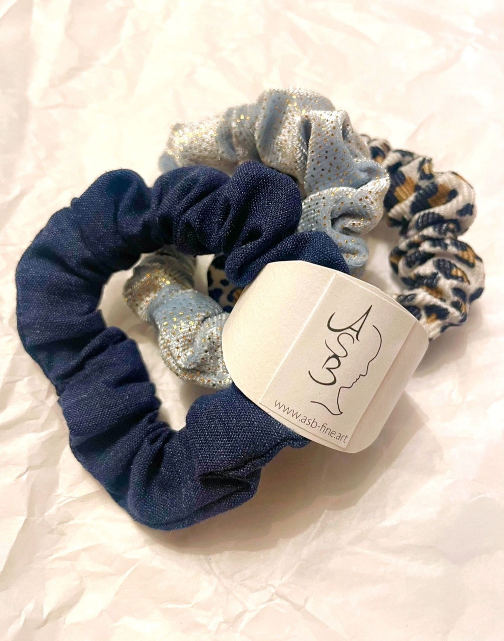 Drei handgefertigte Haarbänder aus Stoff mit integriertem Elastikband. Praktisch und elegant für alle Haartypen geeignet und auch tragbar als hübsches Accesoires am Handgelenkt.